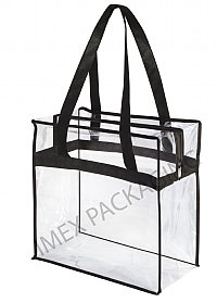 12" x 12" x 6" 5 Panel Zipper Tote Bag; 8 Gauge Clear Phthalate Free Vinyl; #4 Black Nylon Zipper Thru Top And Down 3" Each Side; Black IMEX Cosmetic POM Puller; Black 75 Gram PPNW Sewn Seams; Two 2-ply 1x26.5" PPNW Handles, Sewn Into 1" Band; Band Is Sewn On All 4 Sides; 200 Per Carton; 1 Carton Minimum