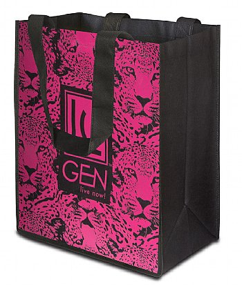 *CUSTOM BAG* - 12" x 15" x 7" 75 Gram Black PPNW Tote; Open Top, No Closure; Black Sewn PPNW Seams, Black Thread; Two (2) 2-Ply 1.5" x 23" Handles, X-Stitched Into 2-Ply Lip, 2" From Edge; One (1) Color (18-2143) Print, Two (2) Hits Of Color