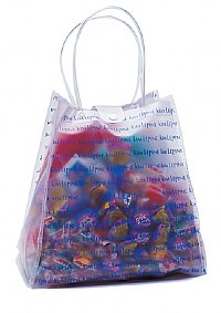 *CUSTOM BAG* - 7.25" x 9" x 2.25", 6 Gauge Double Polished Clear Vinyl, Open at Top; Flap with (1) PP Snap at Top of Bag Between Handles, Sewn Seams with Clear PVC Binding, (2) 10" Clear Piping Handles Sewn to Sides of Bag with Reinforcement, 1-Color Print on Front & Back Panels