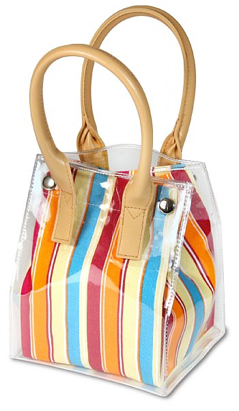 *CUSTOM BAG* - 14.5cm x 18cm x 10cm Top, 12.5cm Bottom, Outside: 0.5mm Clear PVC & PVC Leather; Inside: Stripe Canvas, 1" x 1" White Velcro Strip, Heat Sealed with Teeth Marks, (2) PVC Leather Handles Sewn to Front & Back Panels, Detachable Canvas Bag is Attached to PVC Bag with (4) Metal Snaps